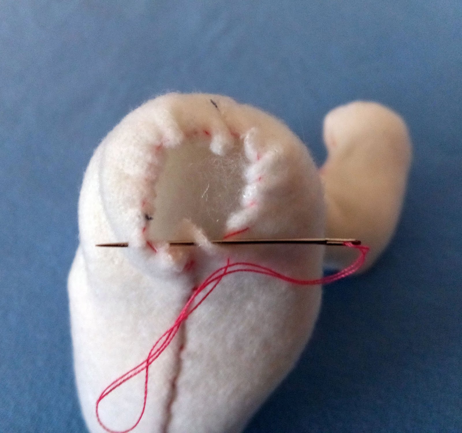 Las orejitas se las une antes de colocarlas en el agujero que le dejamos en la parte superior de la cabeza, luego unimos todo con la aguja e hilo al tono, con puntadas bien discretas.